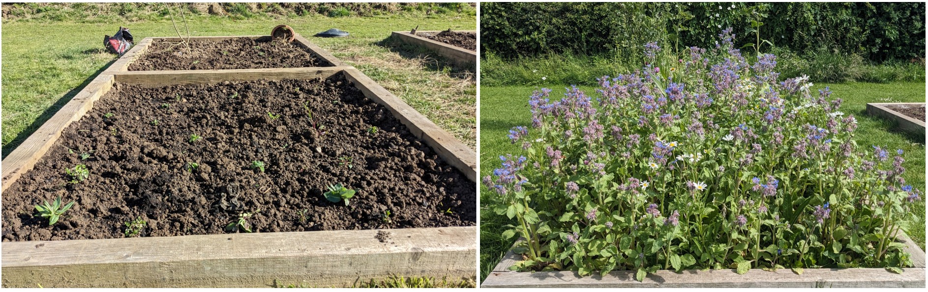 Local Primary School: We offered some of our surplus plants to the school in our home village and in spring 2025 the children planted 16 different species of wildflowers, a total of 138 plants, in a raised bed, a patio area and a small woodland, all in just one afternoon. Species planted included teasel, ox-eye daisies, ragged robin, red campion, cuckoo flowers and melancholy thistle. Scabious, cat’s ear and knapweed were among those kindly donated by https://hermitagefieldcommunitymeadow.com/. The children carefully watered it throughout the long dry spell and three months later it is beautiful! Lots of borage, that was already in the soil, but if you look closely you can see the daisies, a mel thistle and a teasel whilst the ragged robin has gone to seed. Bees were busy buzzing in the summer sun.